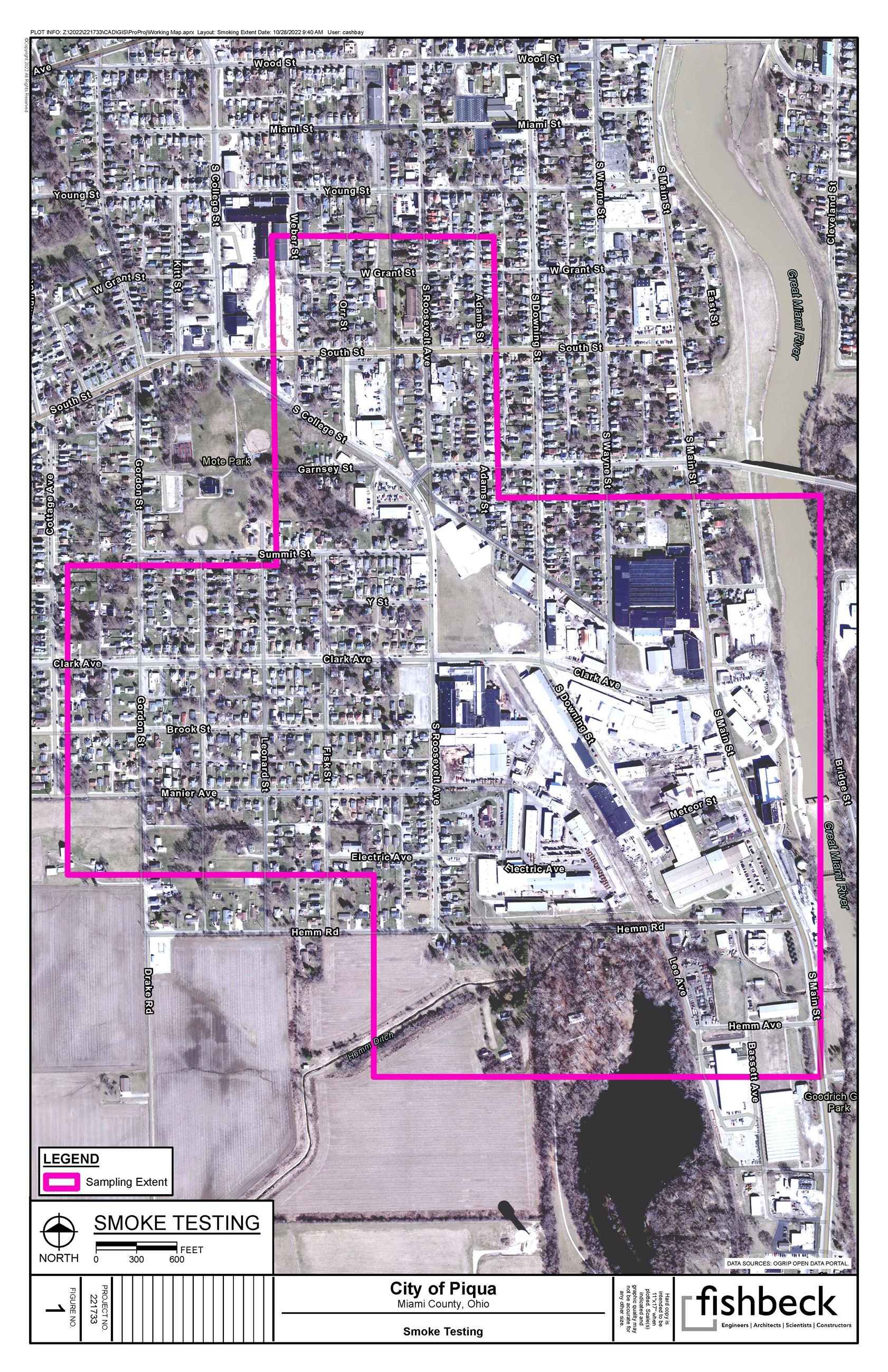 Fishbeck Inc. work crews in collaboration with the City of Piqua’s Utilities Department will be conducting smoke testing of the sanitary sewers ( weather permitting) the week of November 28, 2022, through December 2, 2022.  These tests will assist the department in locating breaks and defects in the sewer system.  Please see the attached map of the testing areas/locations.
